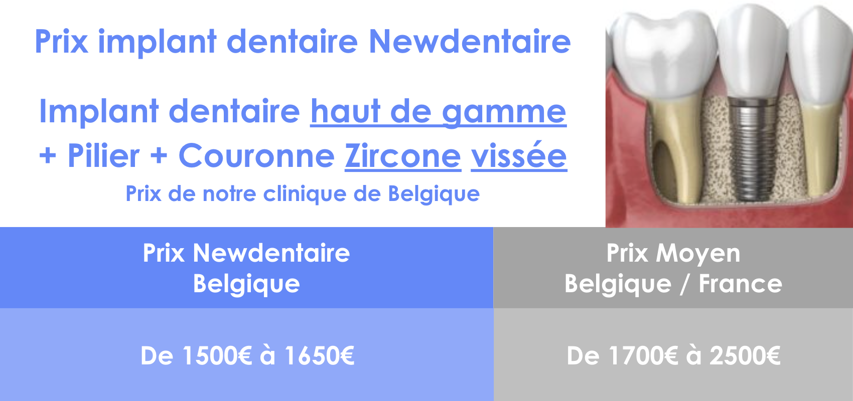 Le prix d’un implant dentaire complet en Belgique est compris entre 1800€ et 2500€.